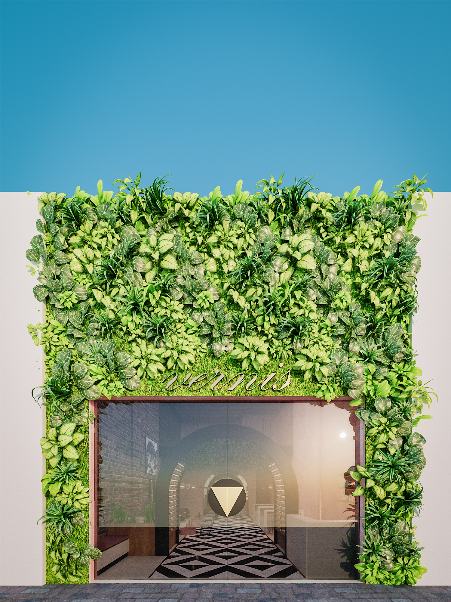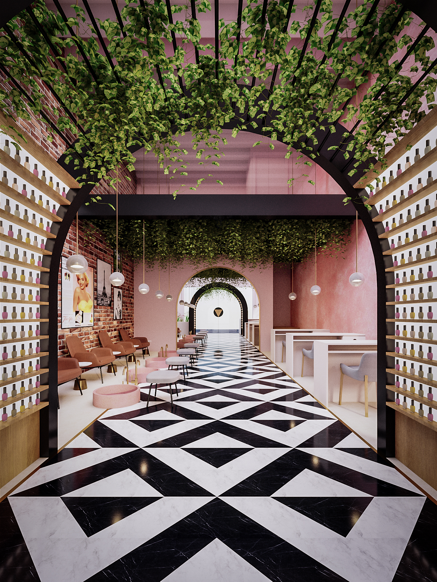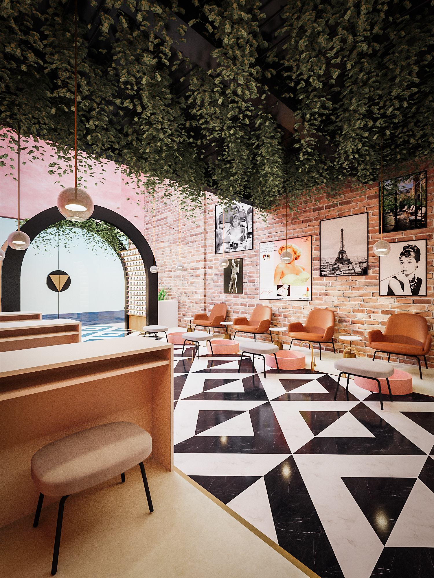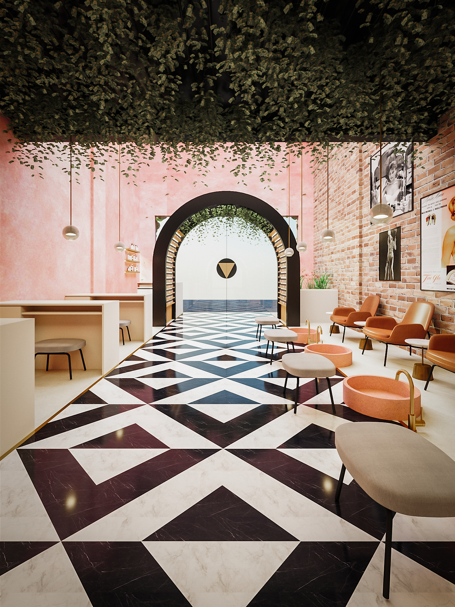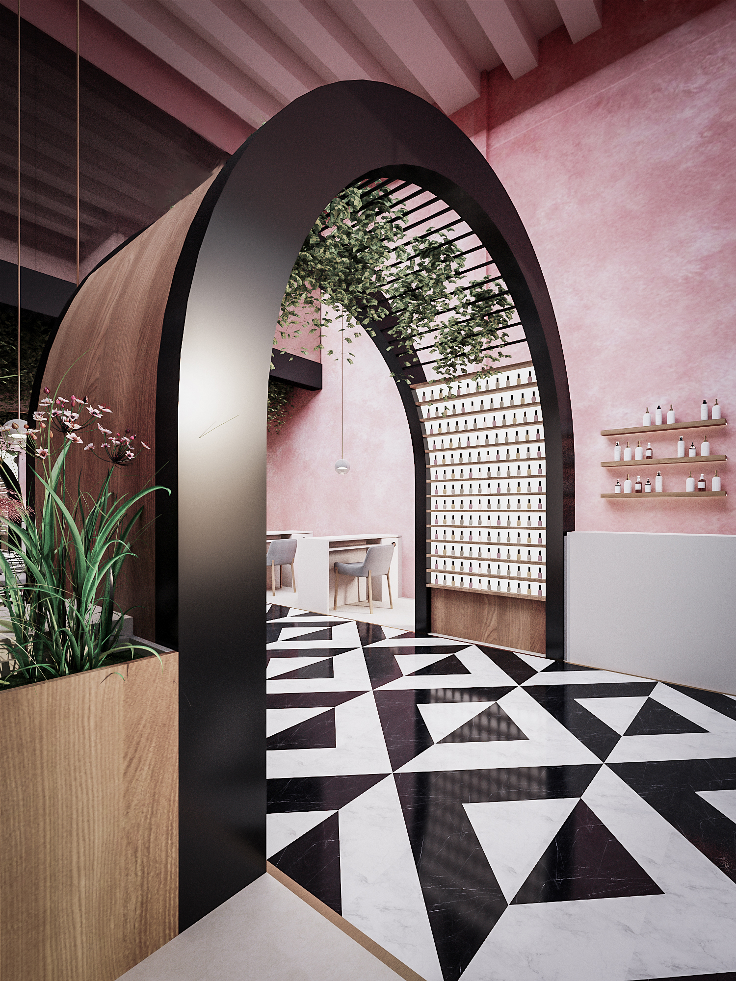 features a stunning blend of geometric elegance and natural elements. The space is defined by bold black-and-white patterned marble flooring, softened by pink-toned walls and warm lighting. Hanging greenery weaves through archways, creating a tranquil ambiance. The use of modern furniture, such as plush seating and minimalist tables, adds sophistication, while the strategic shelving and pendant lighting bring functional beauty. This design balances luxury with a welcoming atmosphere, perfect for a high-end, chic salon or retail space.