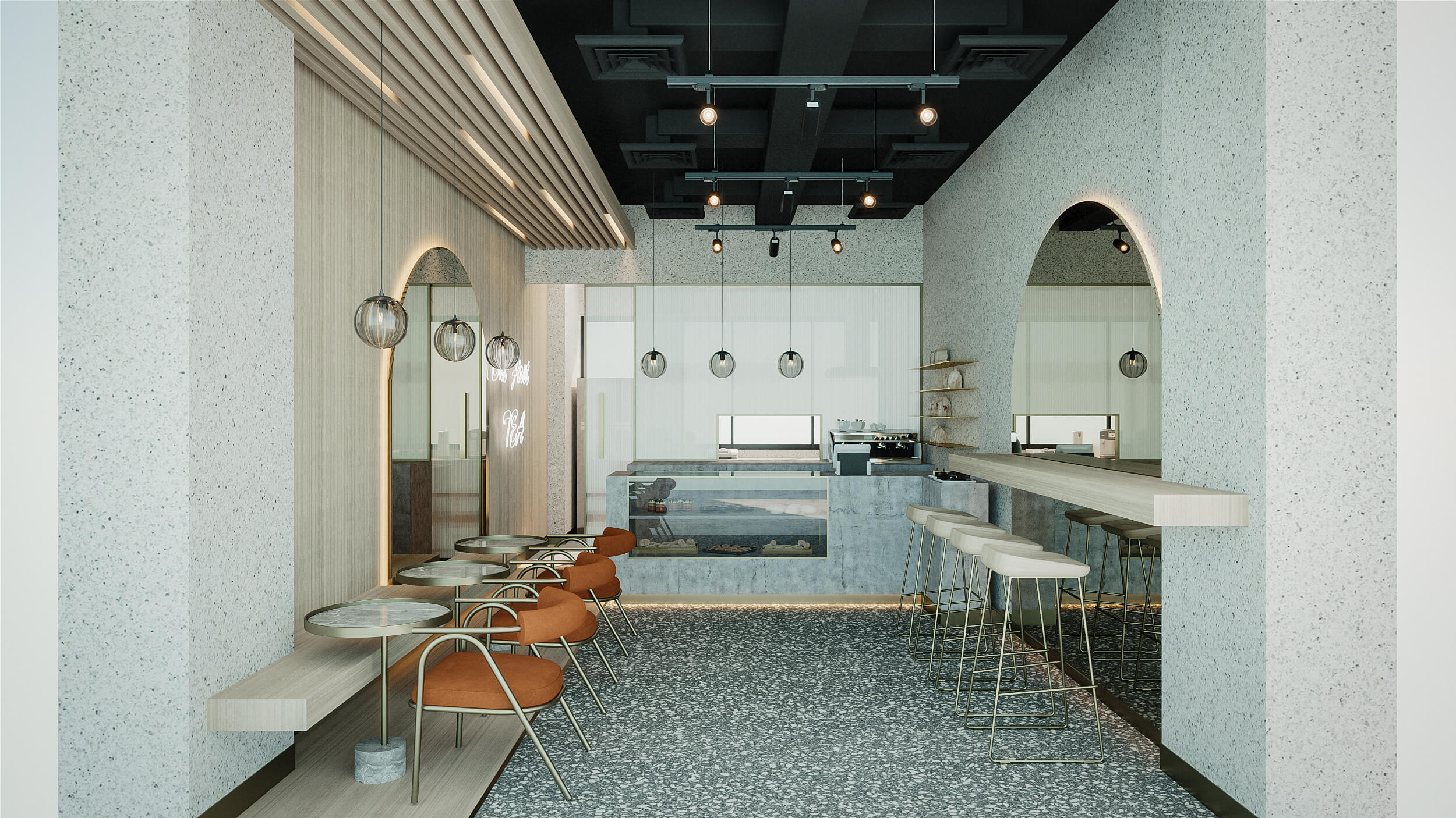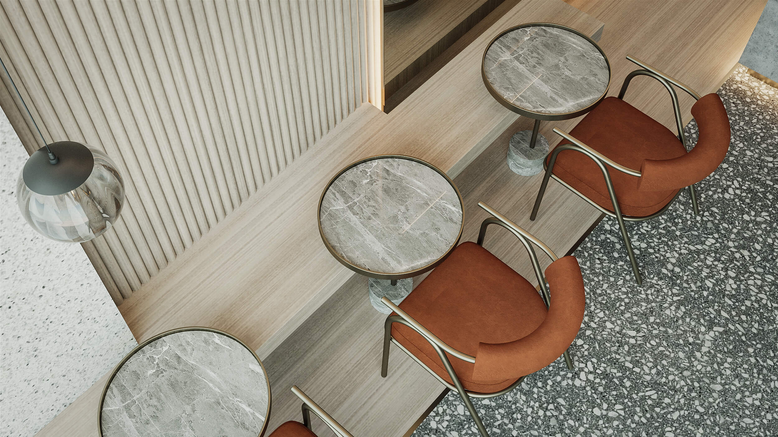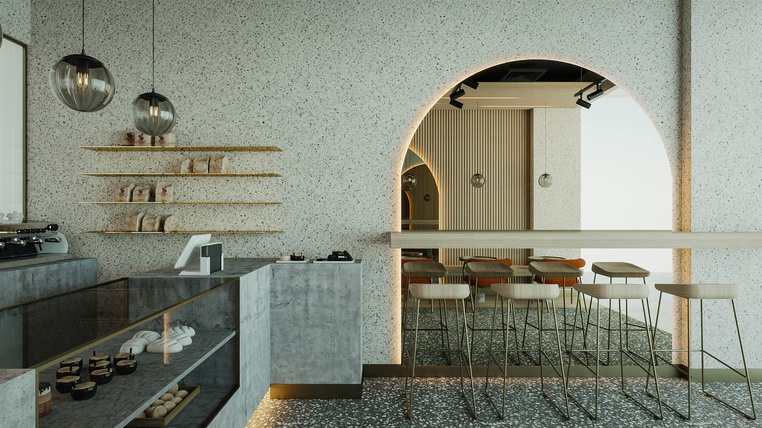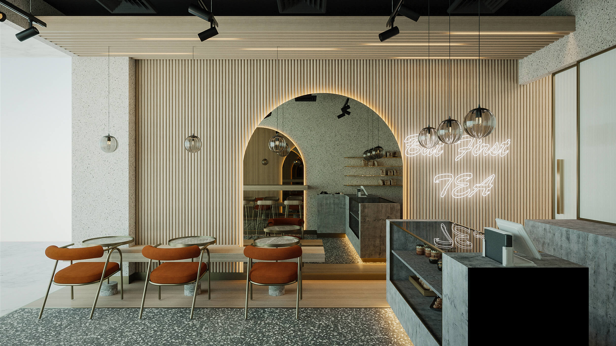 SMB - Chweha Tea Boutique: A contemporary and cozy tea lounge blending minimalist design with a warm, earthy palette. The space features terrazzo textures, brass accents, and layered lighting that create a relaxing ambiance. Arched mirrors, modern pendant lights, and sleek furniture add sophistication, inviting guests to unwind in style and comfort.