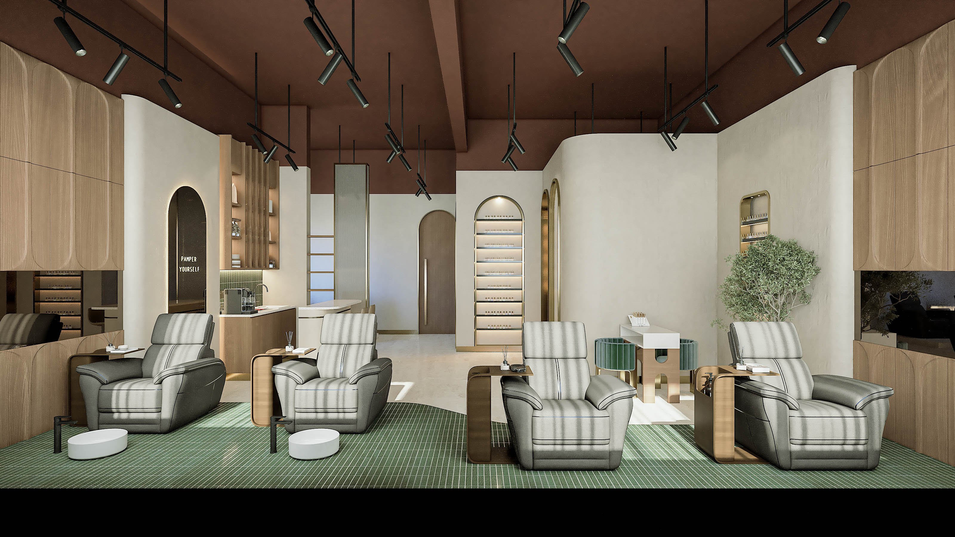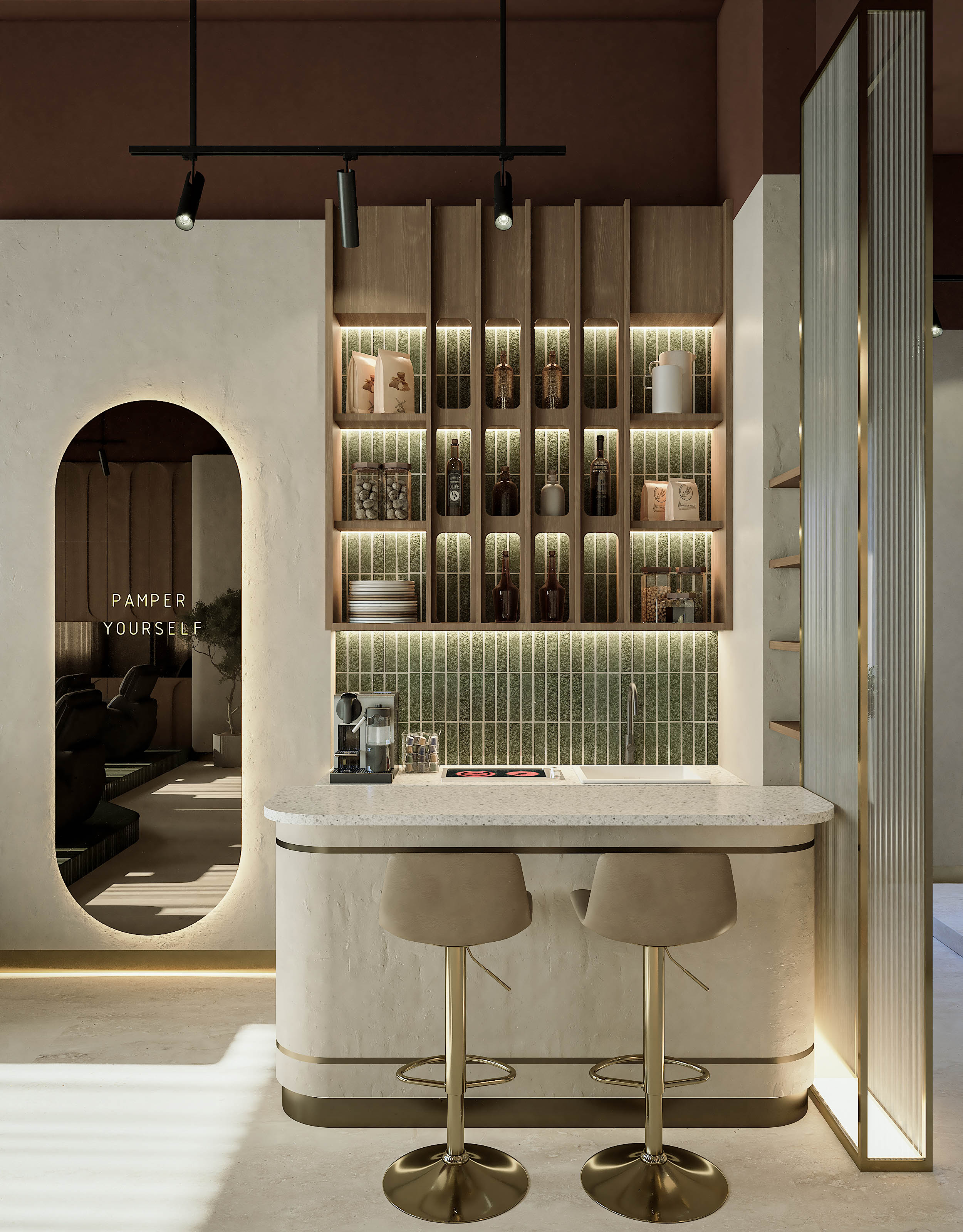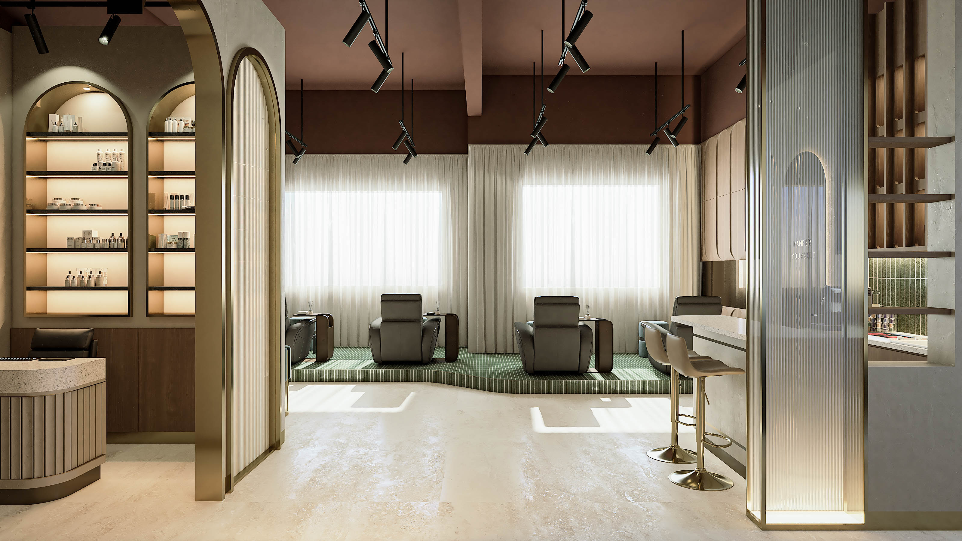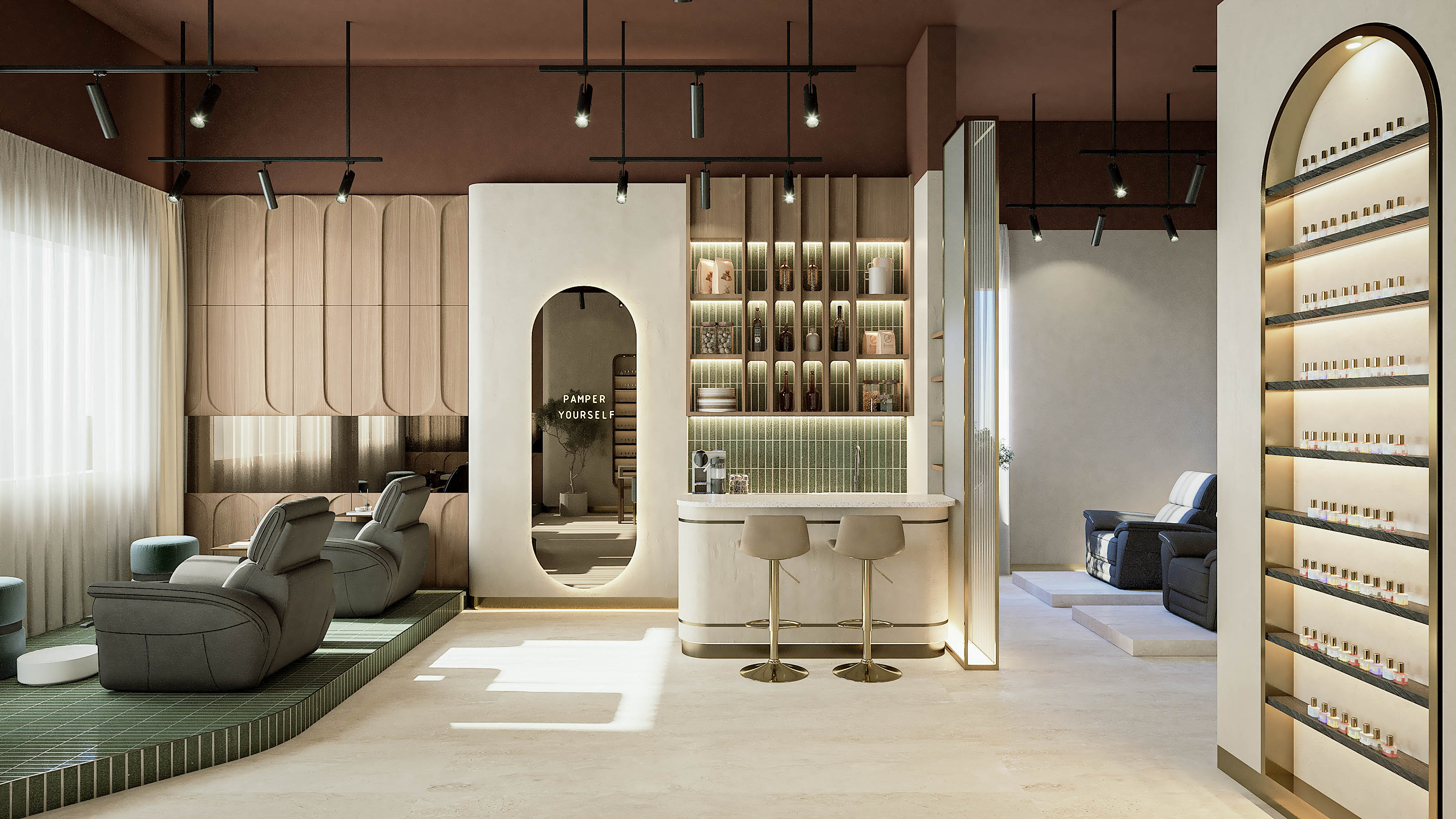 This elegant salon interior showcases a harmonious blend of soft textures, neutral tones, and natural materials, creating a calming atmosphere for guests. The design features curved architectural elements and an earthy color palette that includes warm beige, light wood, and muted green tiles. The focal points include a beautifully lit shelving area displaying high-end products and a sleek, modern bar counter with cozy seating. The spacious layout incorporates luxury reclining chairs for a comfortable experience, while large windows with soft curtains allow natural light to fill the room, enhancing the tranquil environment. This salon design combines aesthetics and functionality, providing clients with a serene and luxurious ambiance for ultimate relaxation and self-care.
