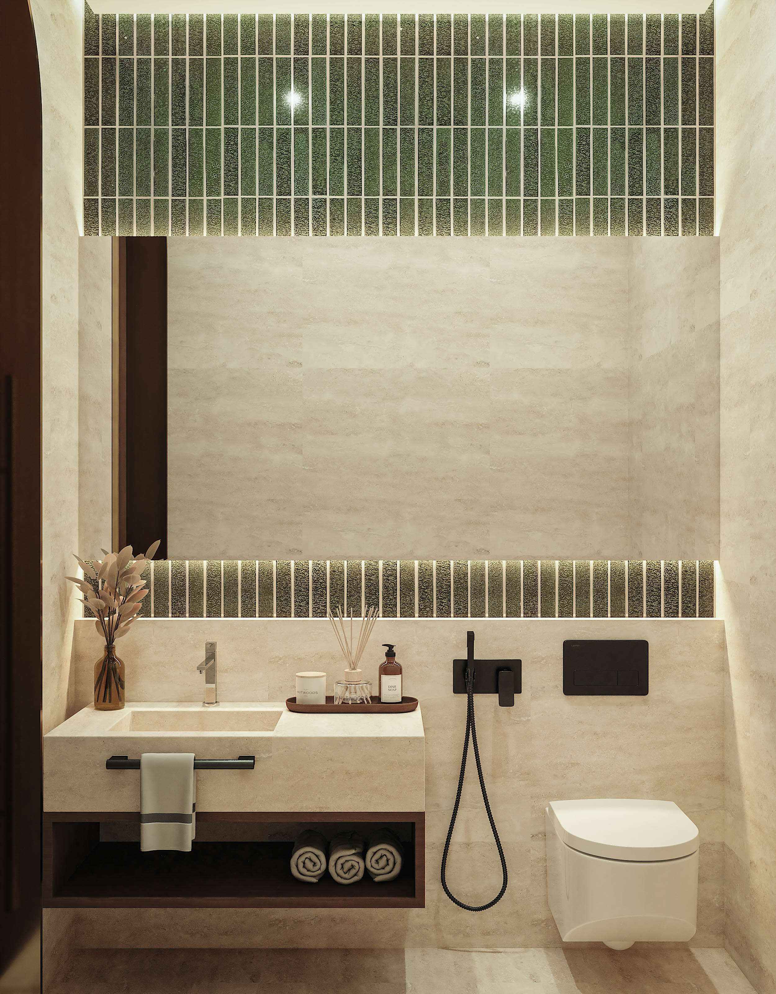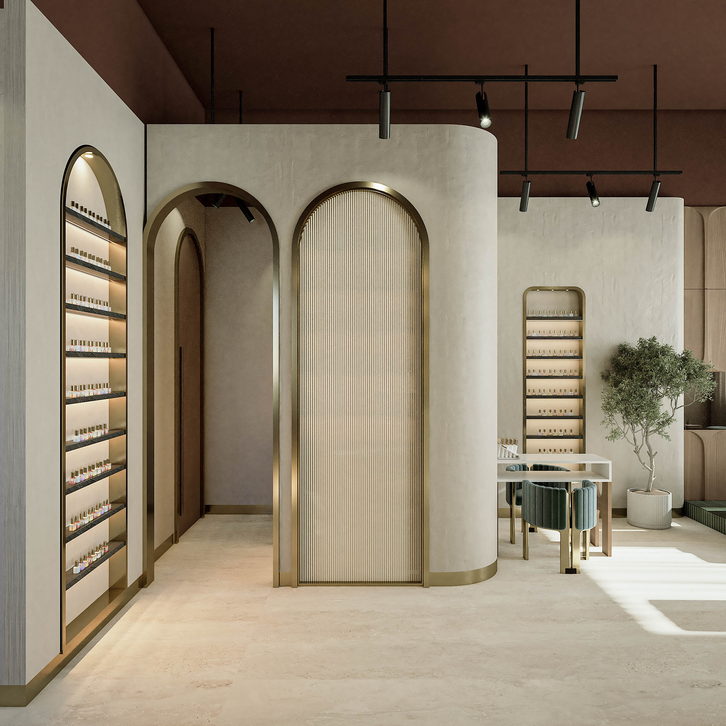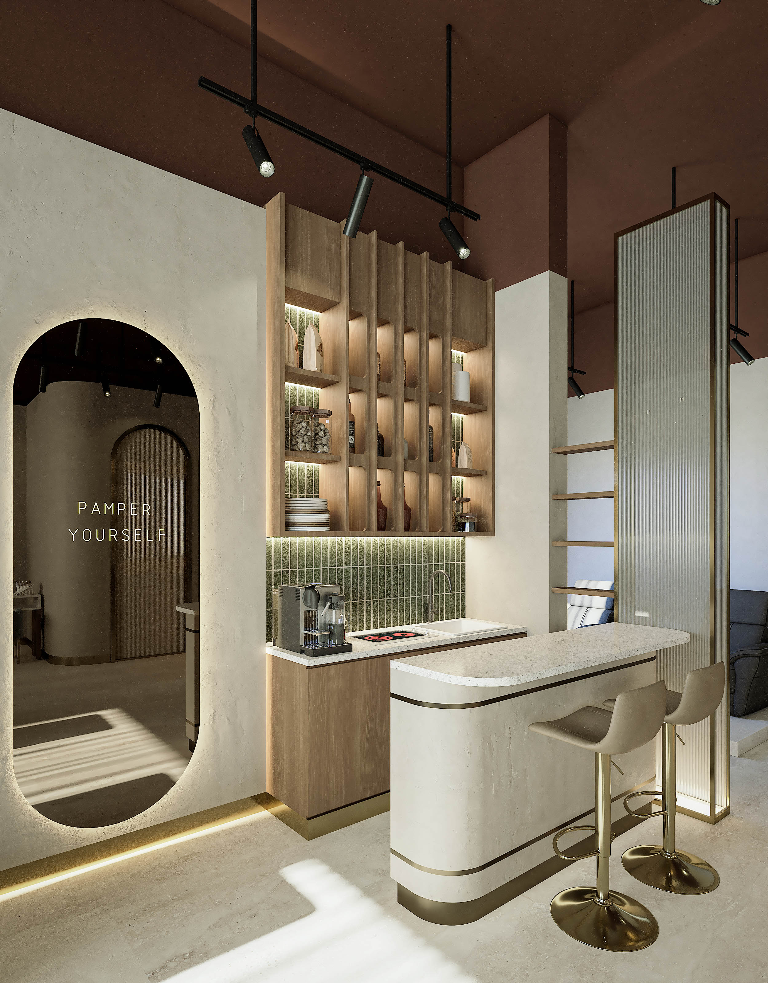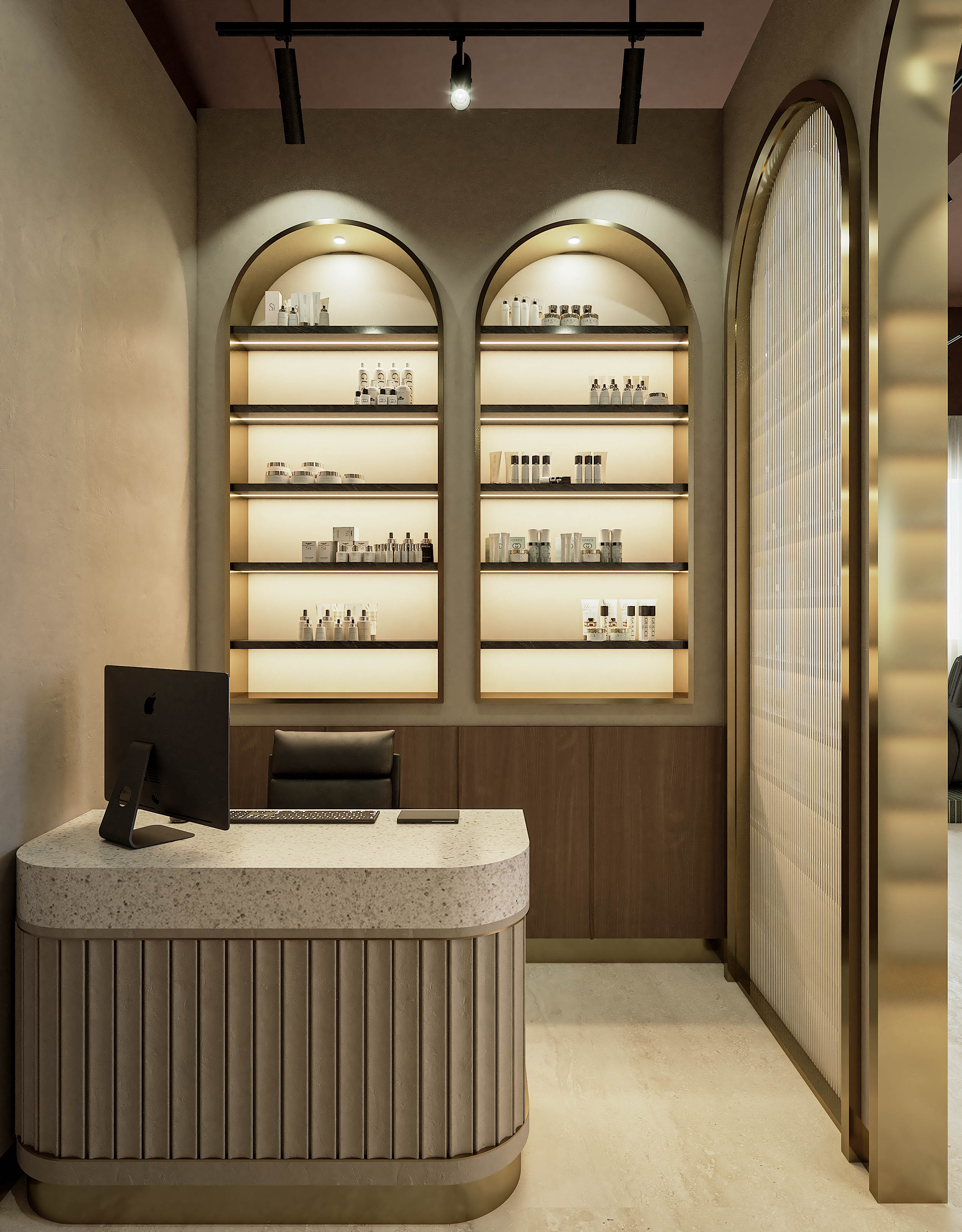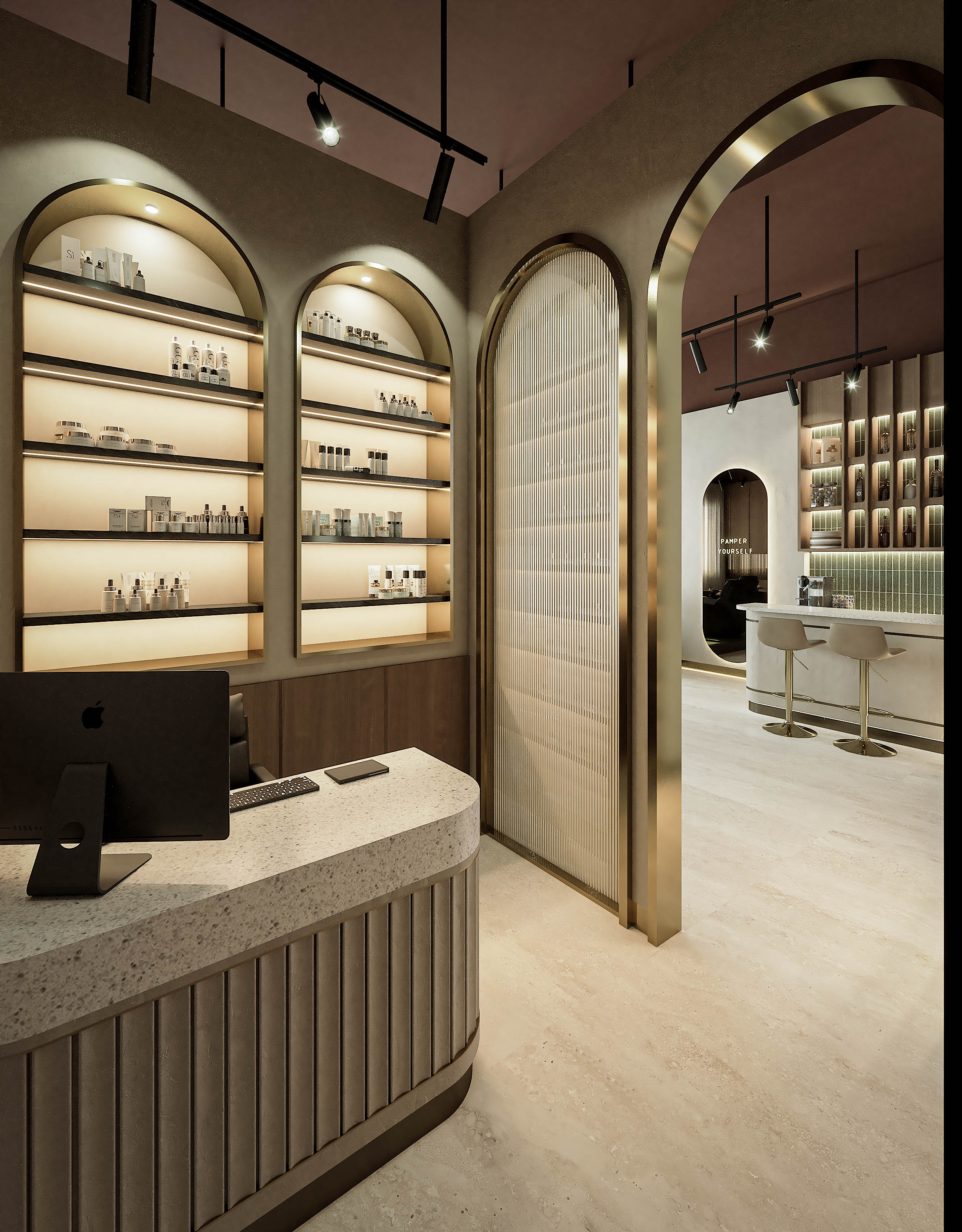 This elegant salon interior showcases a harmonious blend of soft textures, neutral tones, and natural materials, creating a calming atmosphere for guests. The design features curved architectural elements and an earthy color palette that includes warm beige, light wood, and muted green tiles. The focal points include a beautifully lit shelving area displaying high-end products and a sleek, modern bar counter with cozy seating. The spacious layout incorporates luxury reclining chairs for a comfortable experience, while large windows with soft curtains allow natural light to fill the room, enhancing the tranquil environment. This salon design combines aesthetics and functionality, providing clients with a serene and luxurious ambiance for ultimate relaxation and self-care.