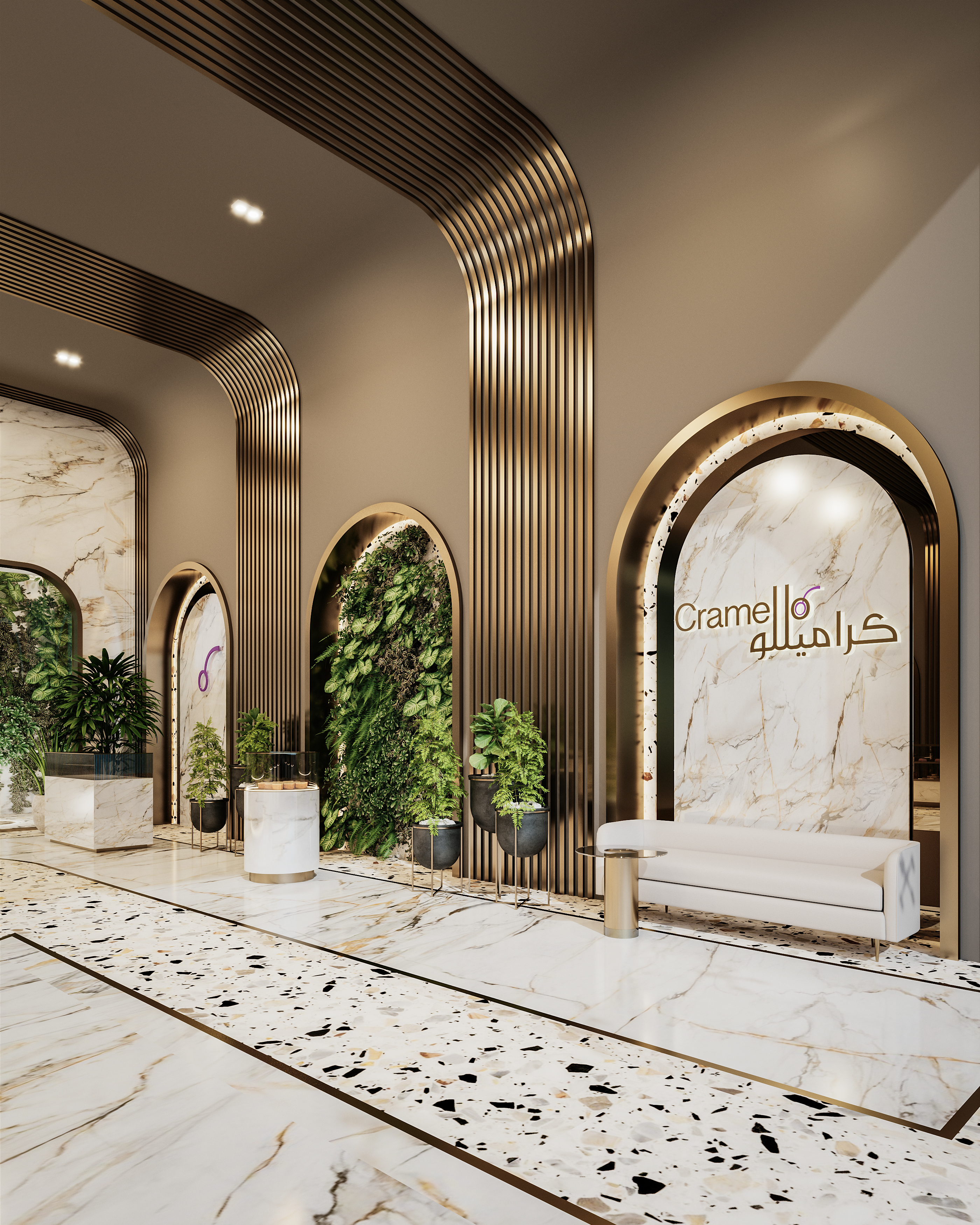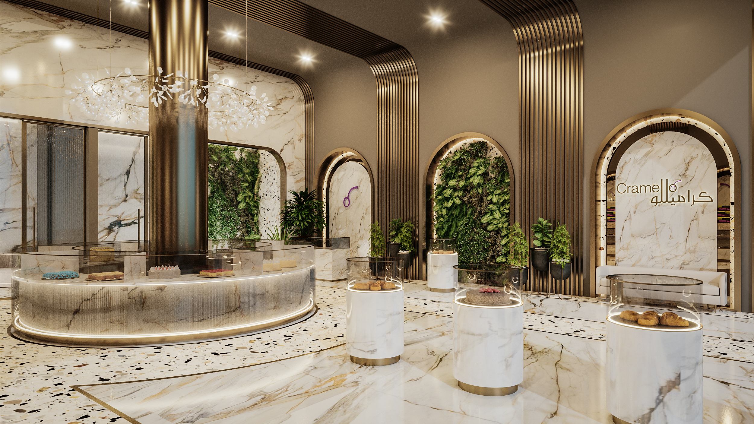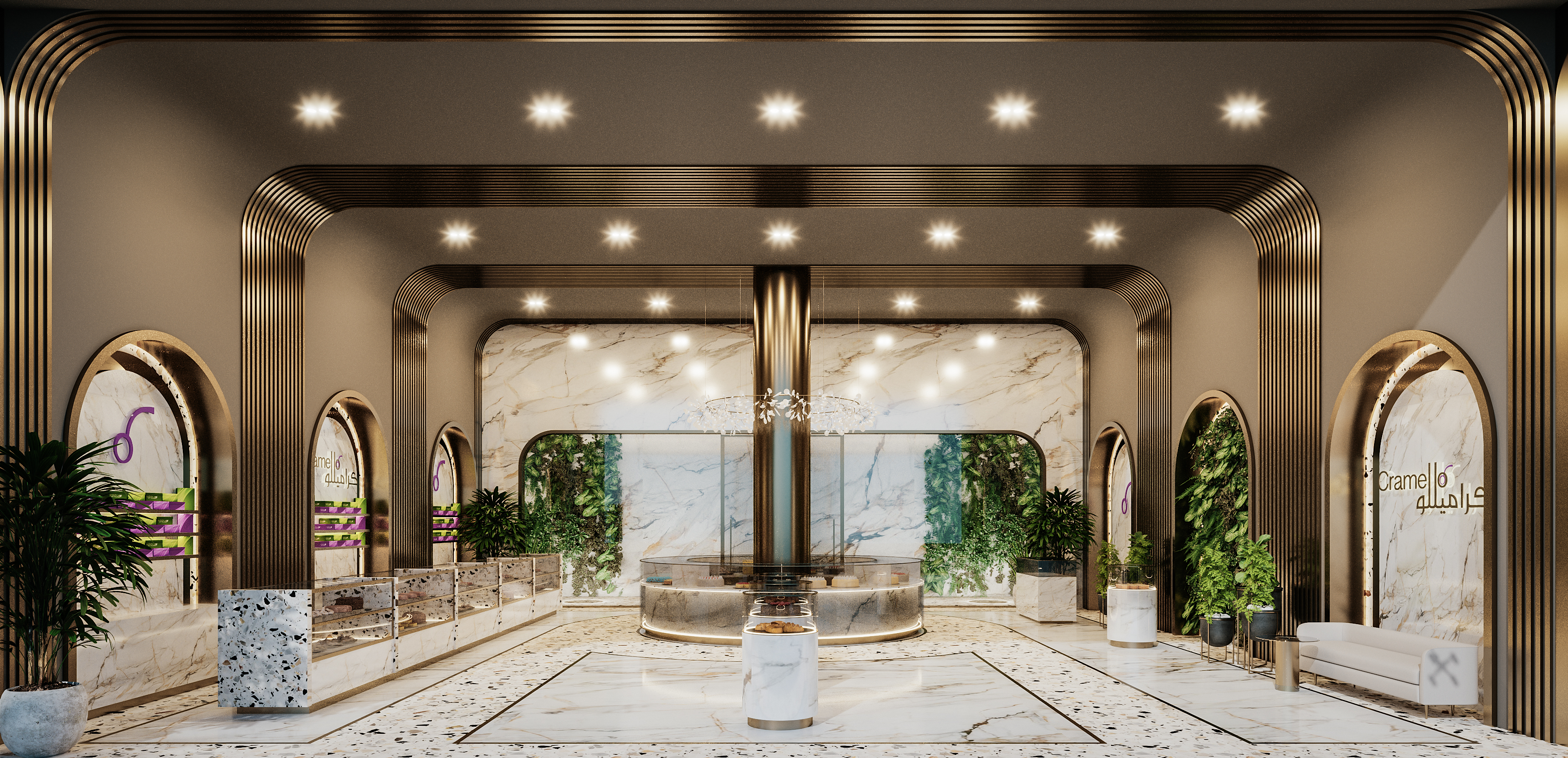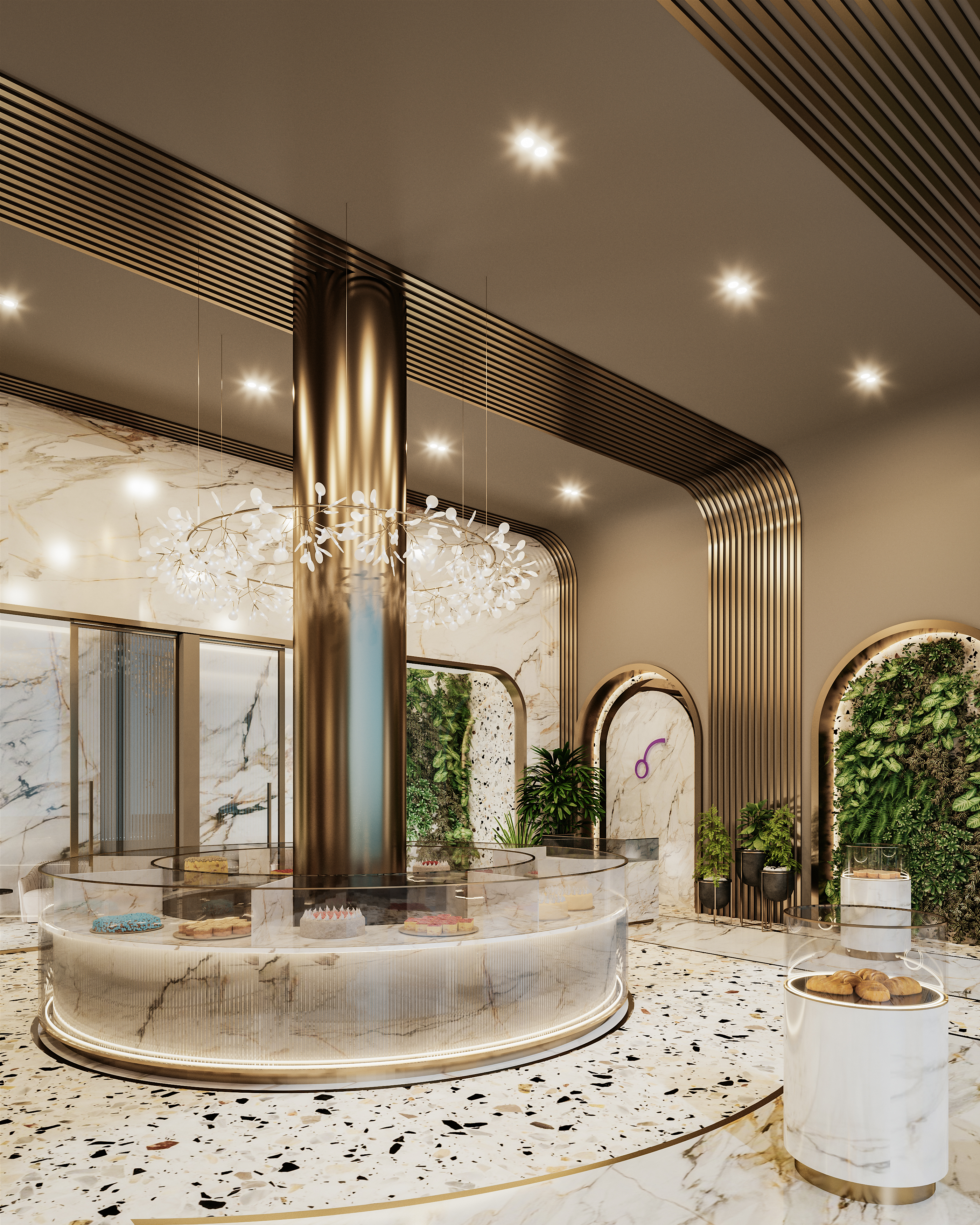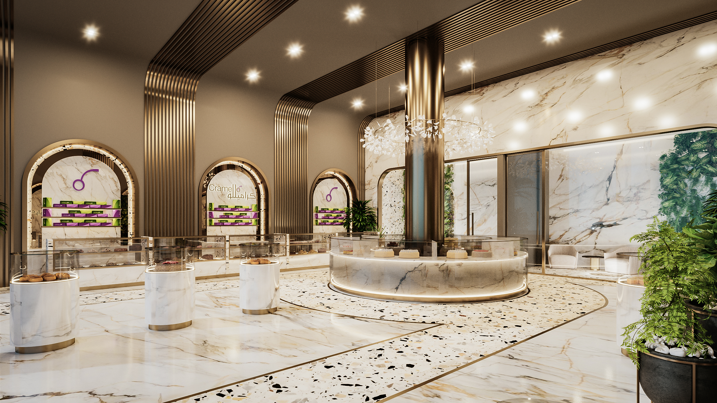 The SMB Luxury Sweet Shop is an opulent space designed to create a premium experience for visitors. Featuring rich textures, elegant lighting, and a palette of luxurious materials such as marble and brass, the shop exudes sophistication. Display areas are thoughtfully arranged to showcase the products in a visually appealing manner, blending functionality with high-end design. The overall aesthetic emphasizes modern luxury, creating an inviting yet exclusive atmosphere for customers to indulge in sweet delights. Every detail, from the fixtures to the layout, is curated to enhance the upscale shopping experience.